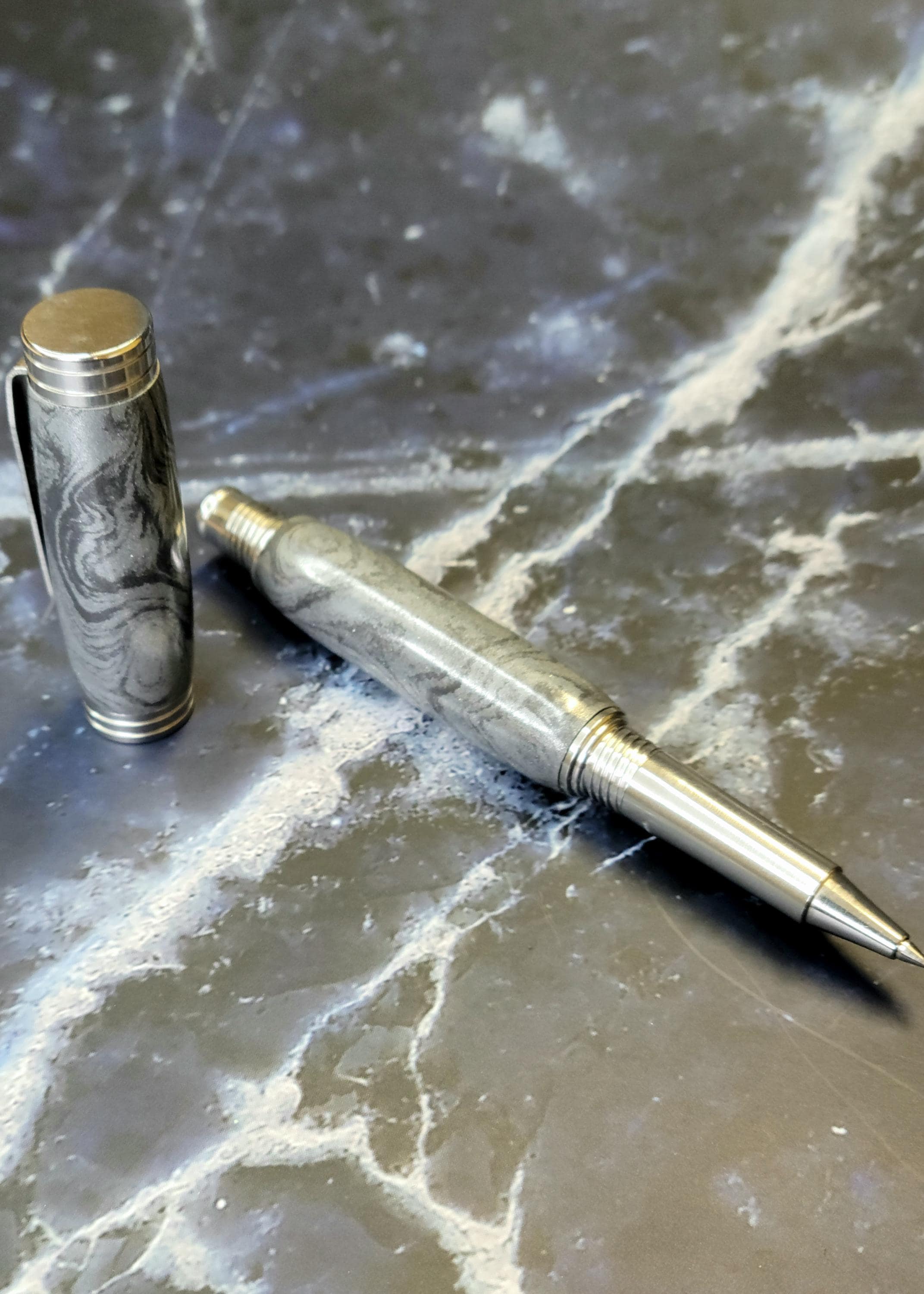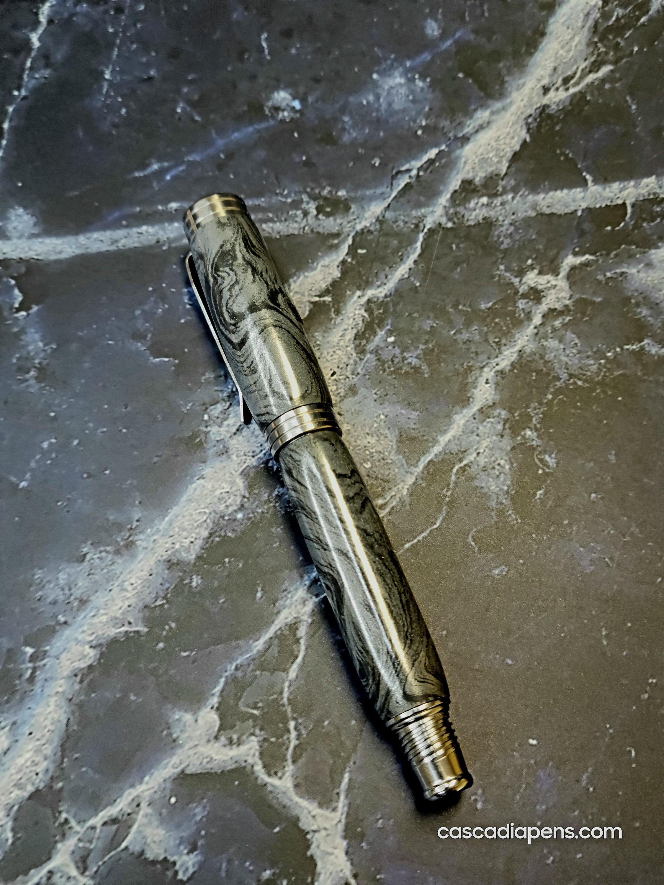 Another classic M3 is the White Mokume, a more subtle look. It's a combination of aluminum on one side and white bronze (the dark grey) on the other. Absolutely love white bronze for the rich grey metallic color it provides. Since M3 is made with real metals, it does weigh more than straight resin blanks. However, this is one of our lighter options, so it's a great choice when you don't want to add a lot of weight.