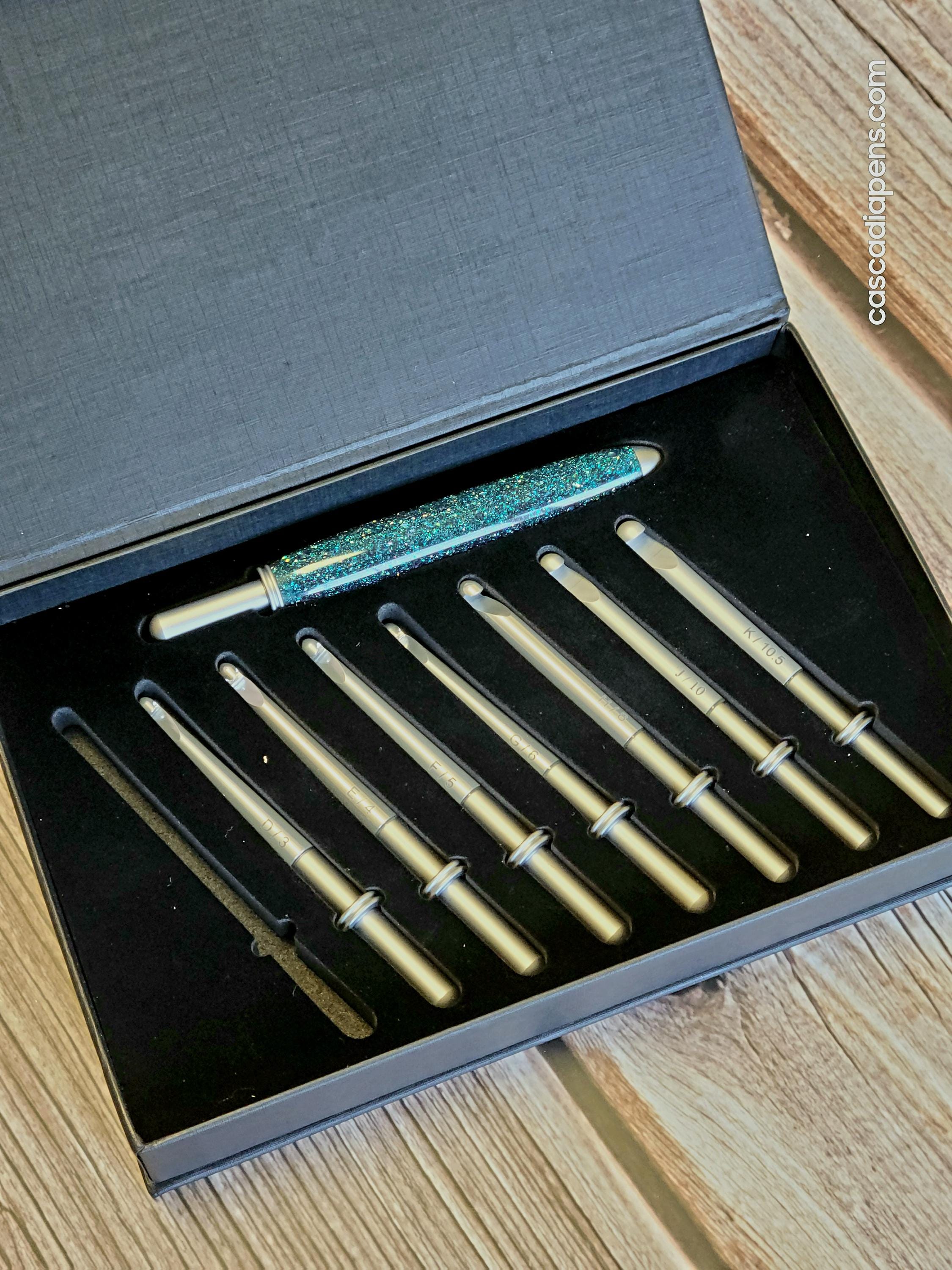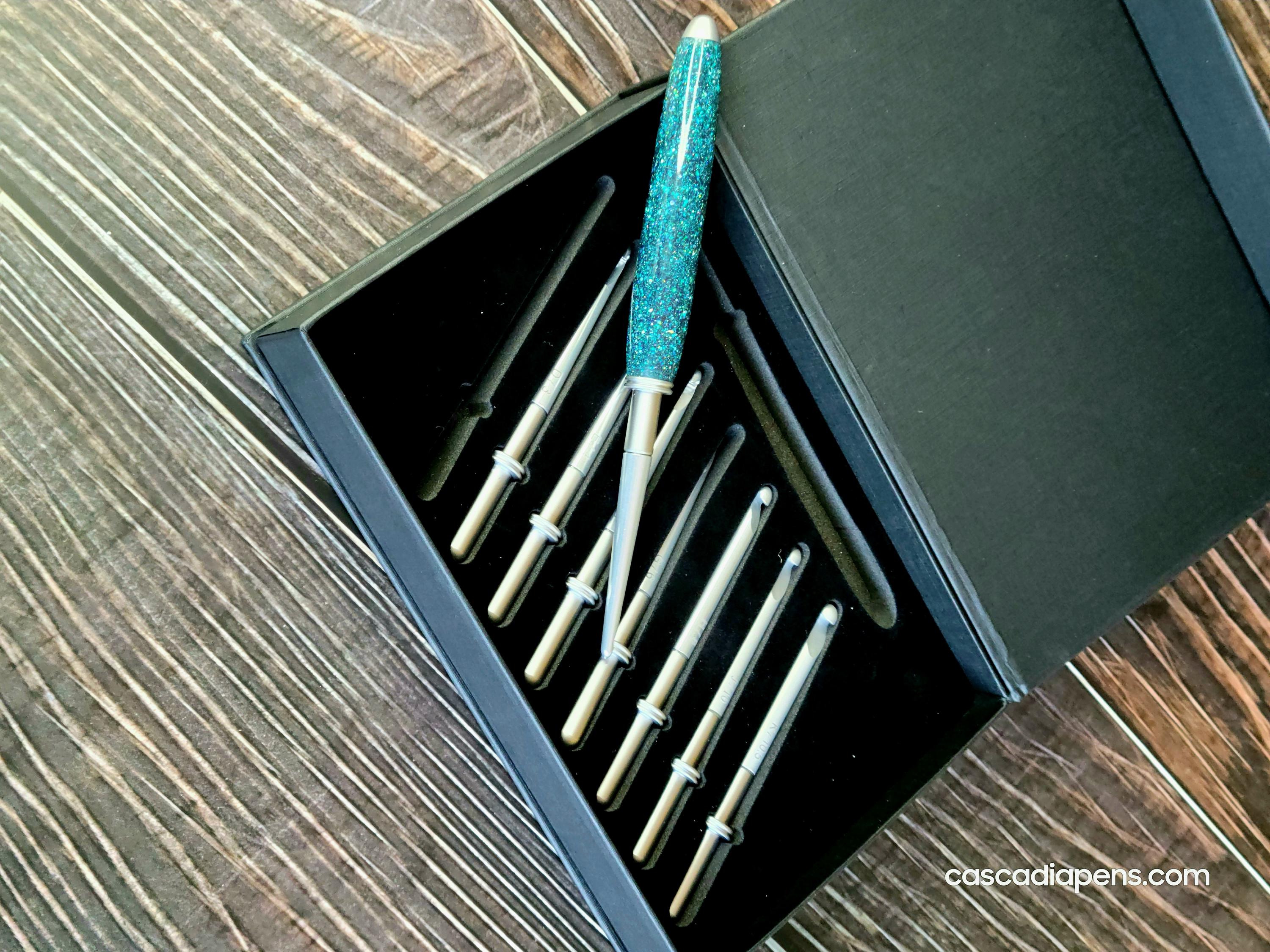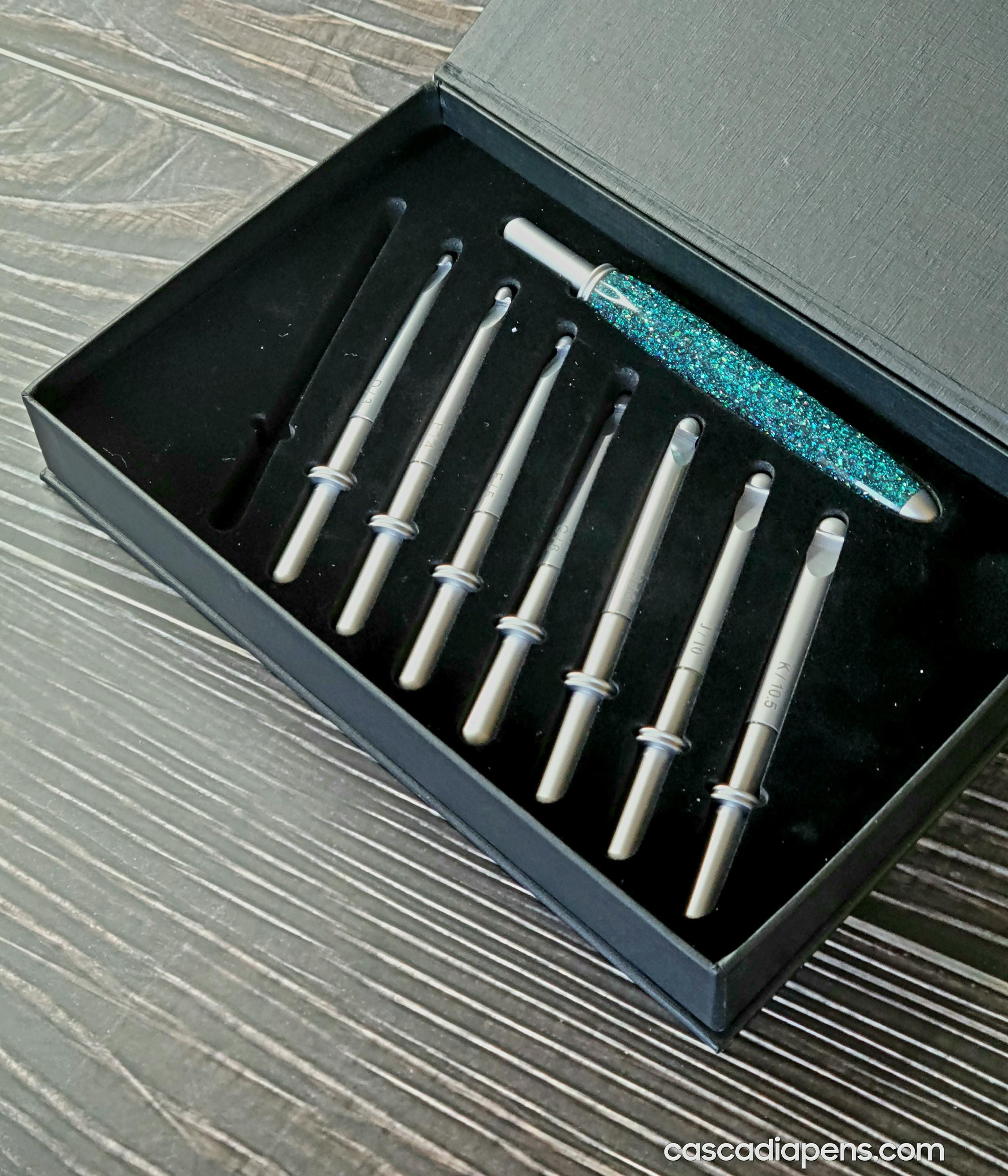 The handle of the Interchangeable Crochet Hook Set is made from resin and contains real, ethically sourced gem-quality diamonds. These diamonds are guaranteed to be conflict-free, making this set a socially responsible purchase.