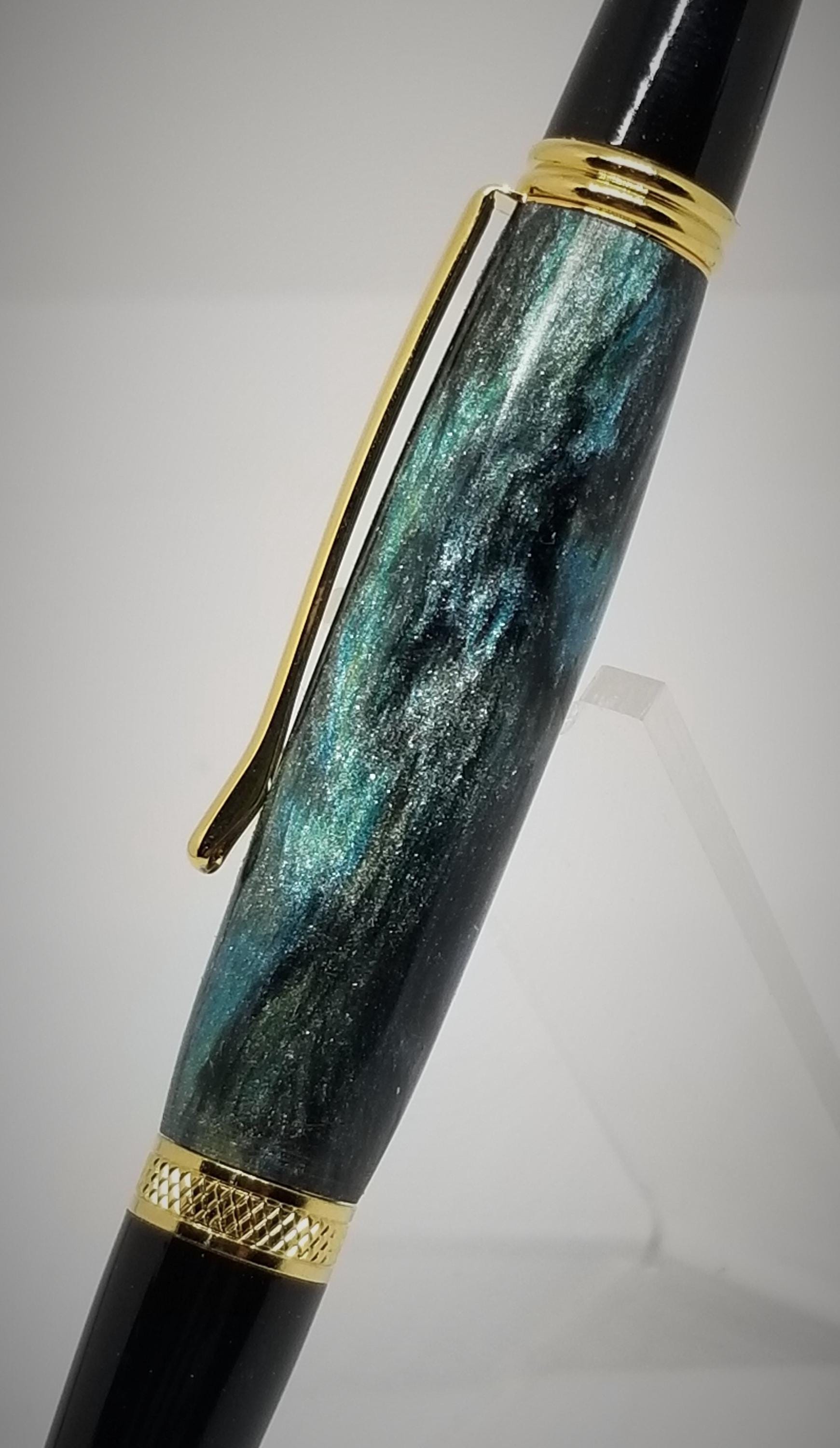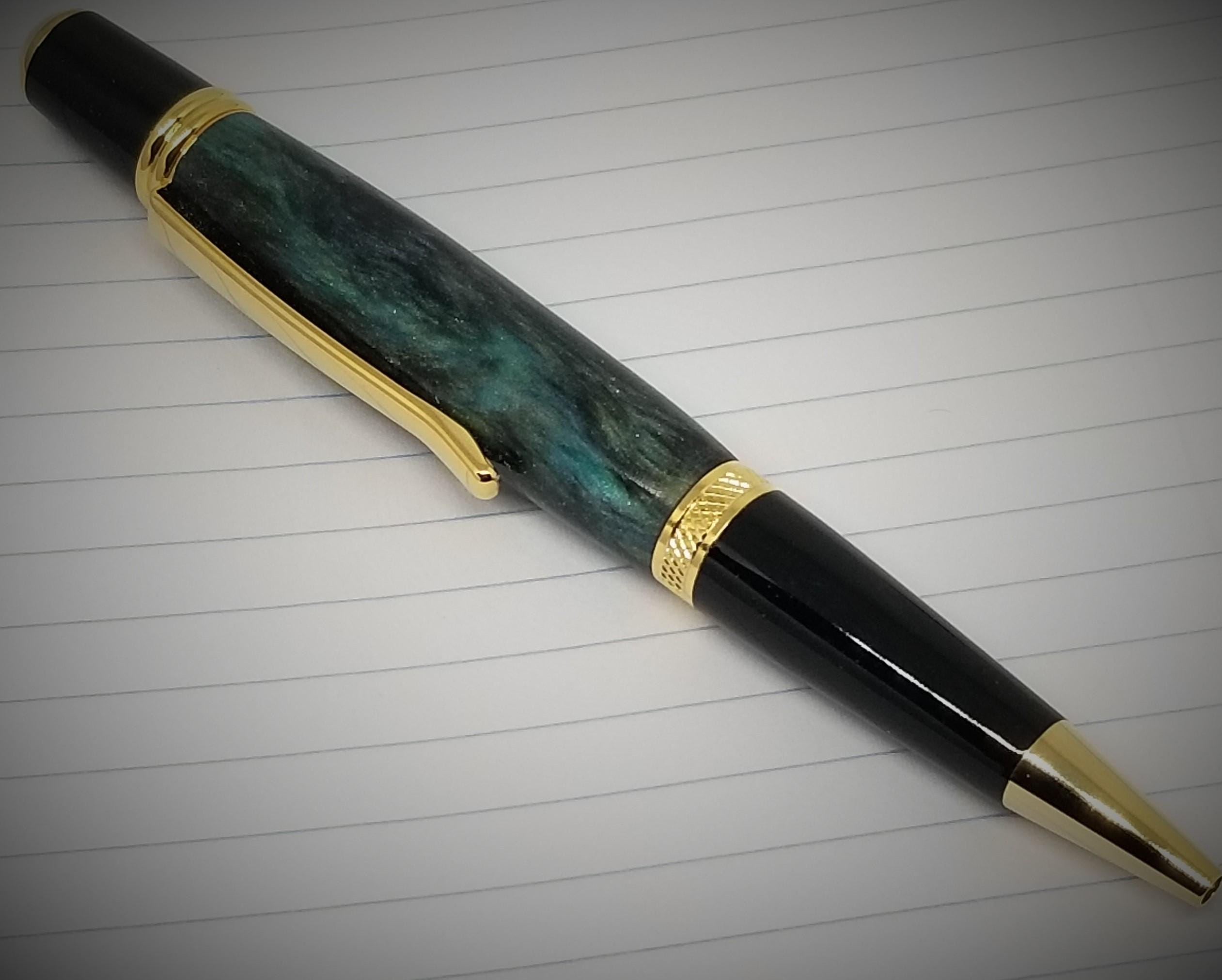 Specification: Type: Ballpoint Twist Pen Finish: Gold and Black Chrome Refill Type: Parker style Ink: Black Length: 5.25" Width: 1/2" Weight: 1.4 oz. Body: DiamondCast - Black and Green Swirls